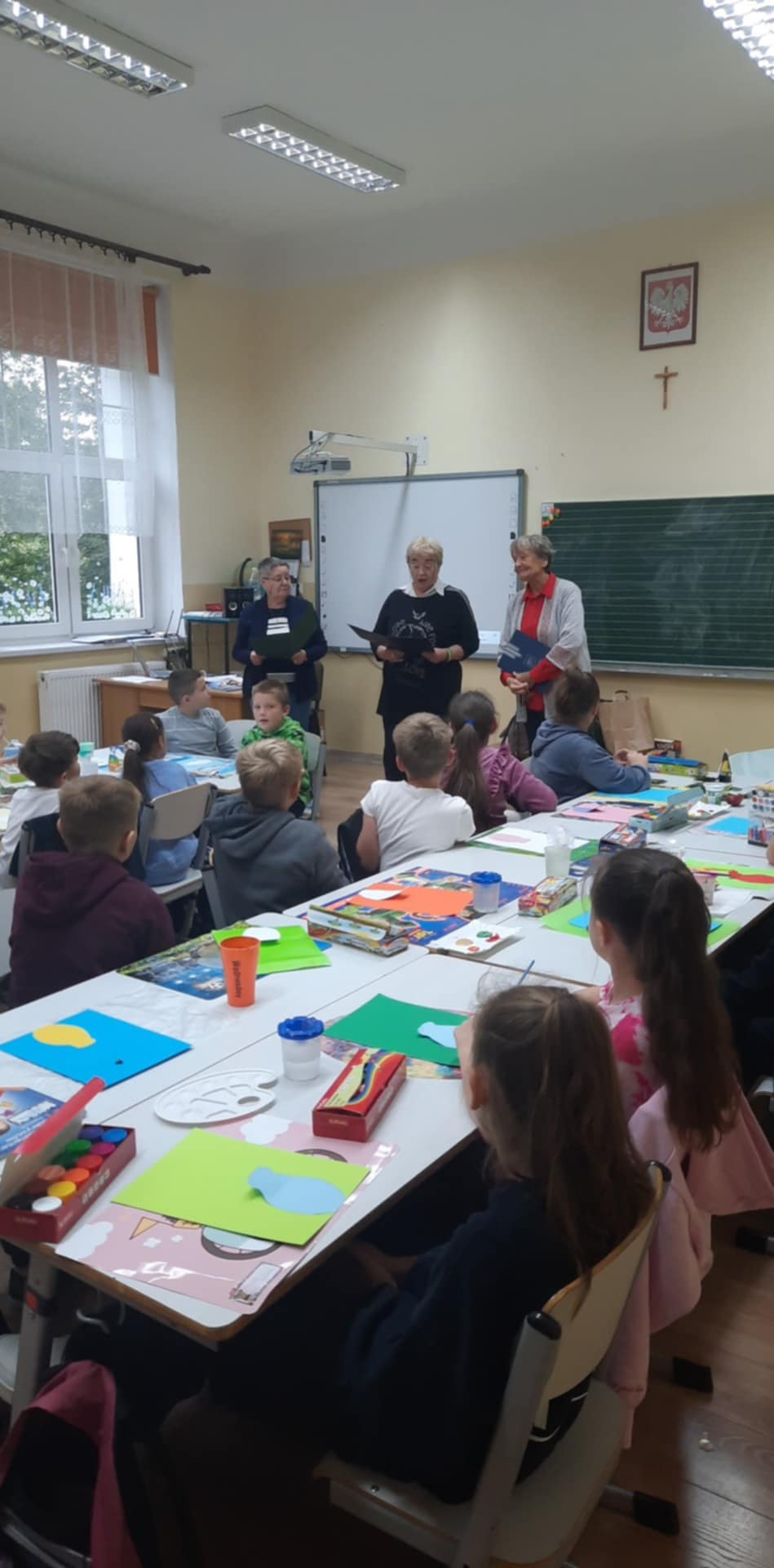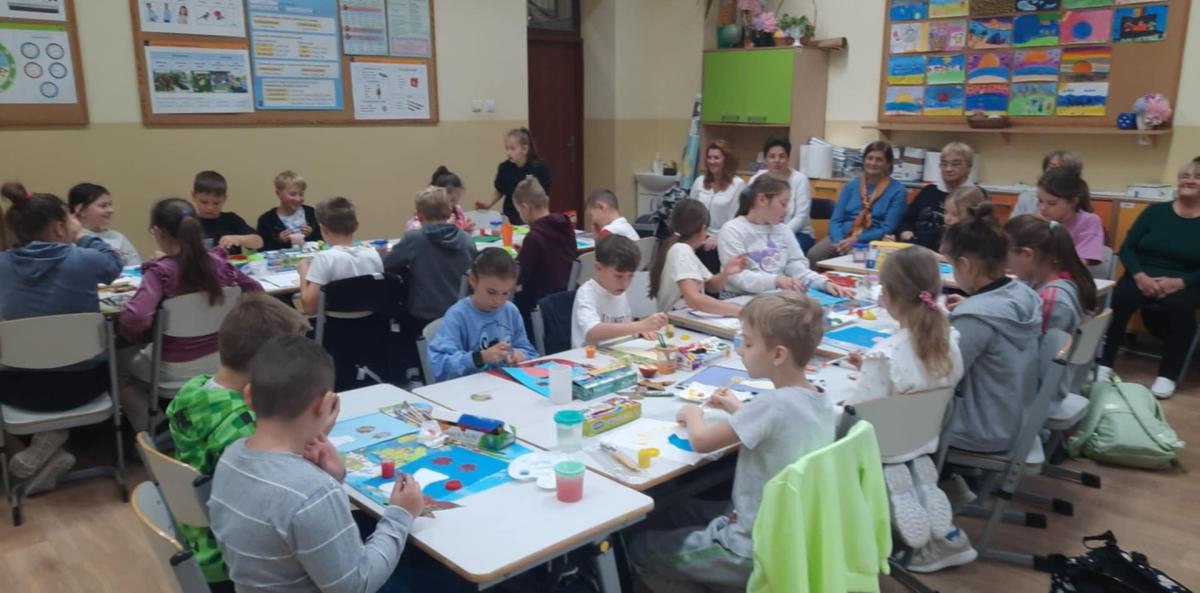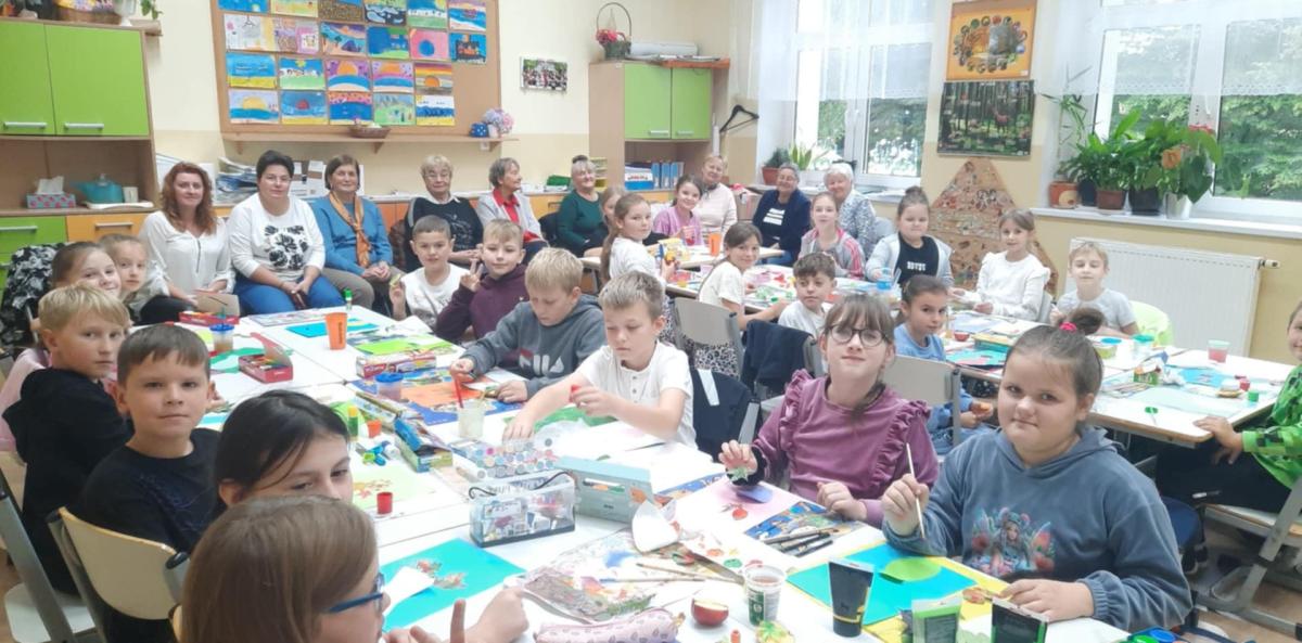 30.09. we wtorek odbyło się w naszej szkole kolejne już Miedzypokoleniowe spotkanie Seniorów z Dziennego Domu Seniora w Gorlicach z dziećmi z klasy trzeciej połączone z warsztatami malarskimi inspirowanymi jesienią. Najpierw nasi goście wprowadzili dzieci w jesienny nastrój poprzez recytację wierszy i podarowali wykonane przez siebie stemple z ziemniaków i zebrane liście, które wykorzystano do tworzenia prac plastycznych. W trakcie zajęć panowała atmosfera wzajemnej współpracy. Seniorzy inspirowali dzieci swoimi wskazówkami, z których one chętnie korzystały. Zajęcia zakończyły się miniwystawą prac, na której wszyscy mogli zaprezentować swoje dzieła, a także miłą, słodką niespodzianką w postaci pysznych ciasteczek upieczonych przez naszych gości. Na koniec wszyscy wyrazili chęć ponownego spotkania w przyszłości.