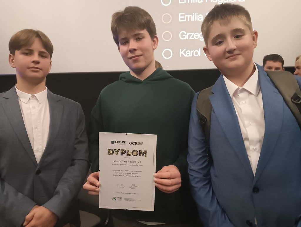 15 października w Gorlickim Centrum Kultury odbył się międzyszkolny quiz wiedzy- Interaktywna lekcja przyrody. Był on poświęcony między innymi przyrodzie i kulturze naszego regionu. Naszą szkołę reprezentowała drużyna w składzie: Adam Brudniak, Adam Malina i Leon Gaber. Wywalczyli oni pierwsze miejsce w klasyfikacji drużynowej.