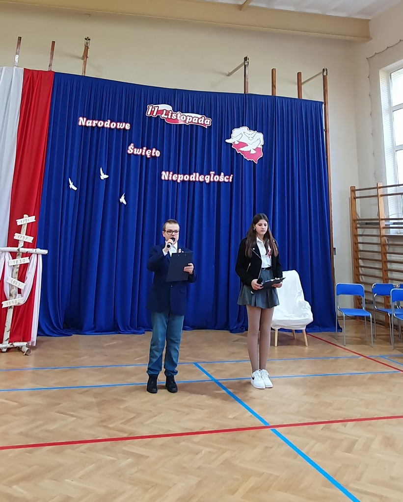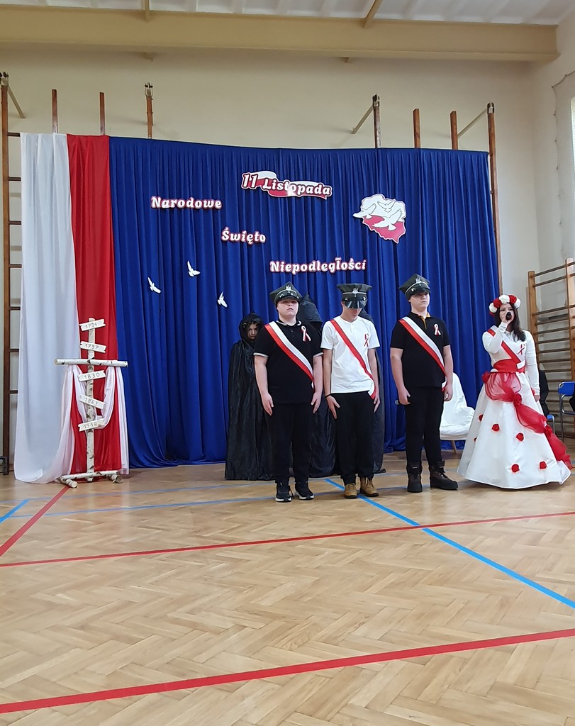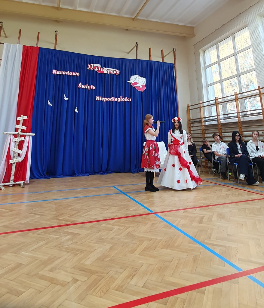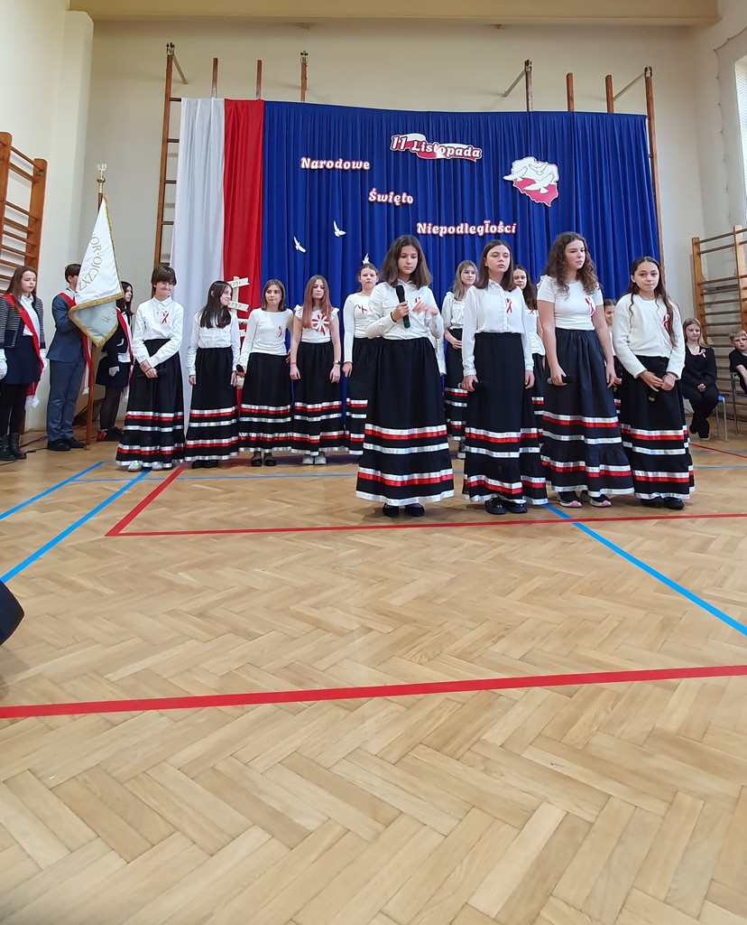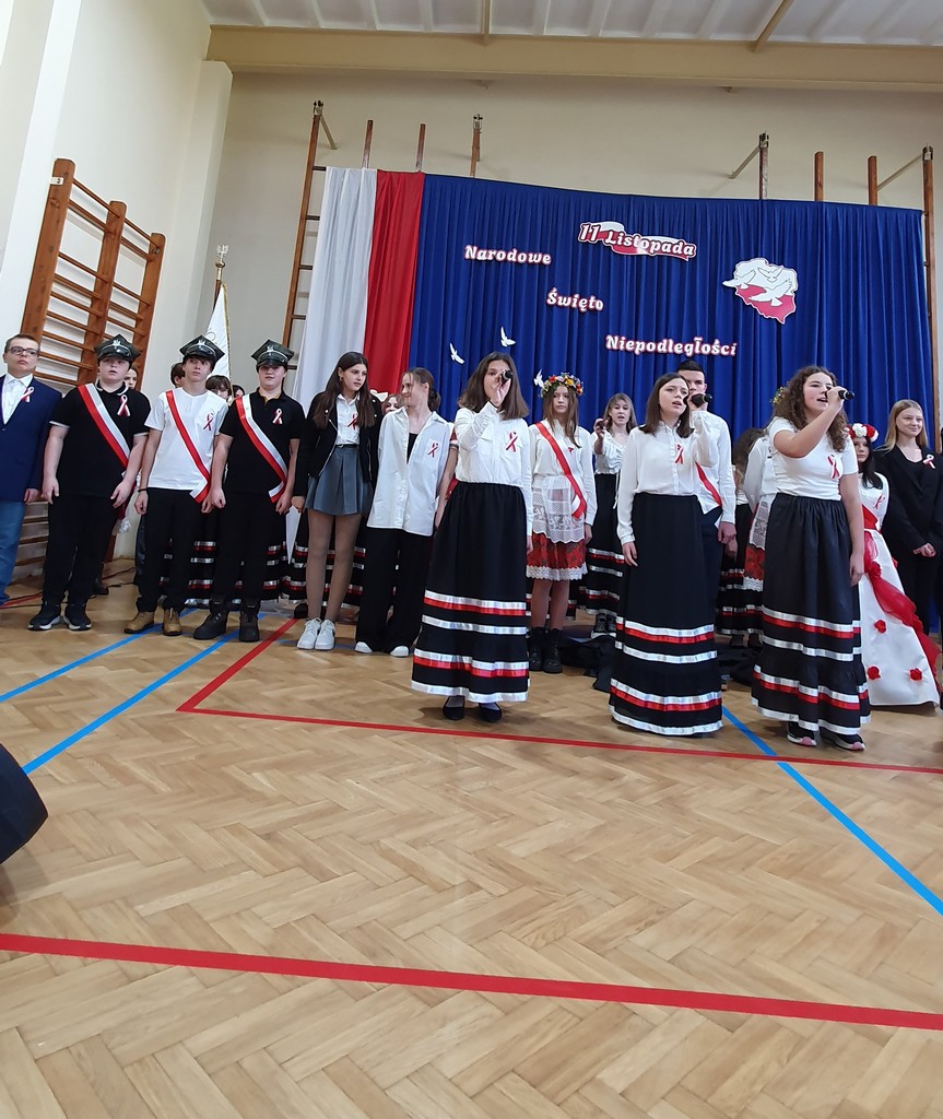 Uroczystość uświetnił występ chóru szkolnego, prowadzonego przez p. Piotra Przyrowskiego, który wprowadził podniosły nastrój, wykonując znane pieśni patriotyczne. Szczególne wzruszenie wzbudziła solistka- Zofia Gliwa, która wykonała poruszającą pieśń o żołnierzach walczących za ojczyznę. Na scenie pojawili się także uczniowie w czapkach z epoki, przypominając o bohaterach polskich powstań i legionistach marszałka Piłsudskiego.