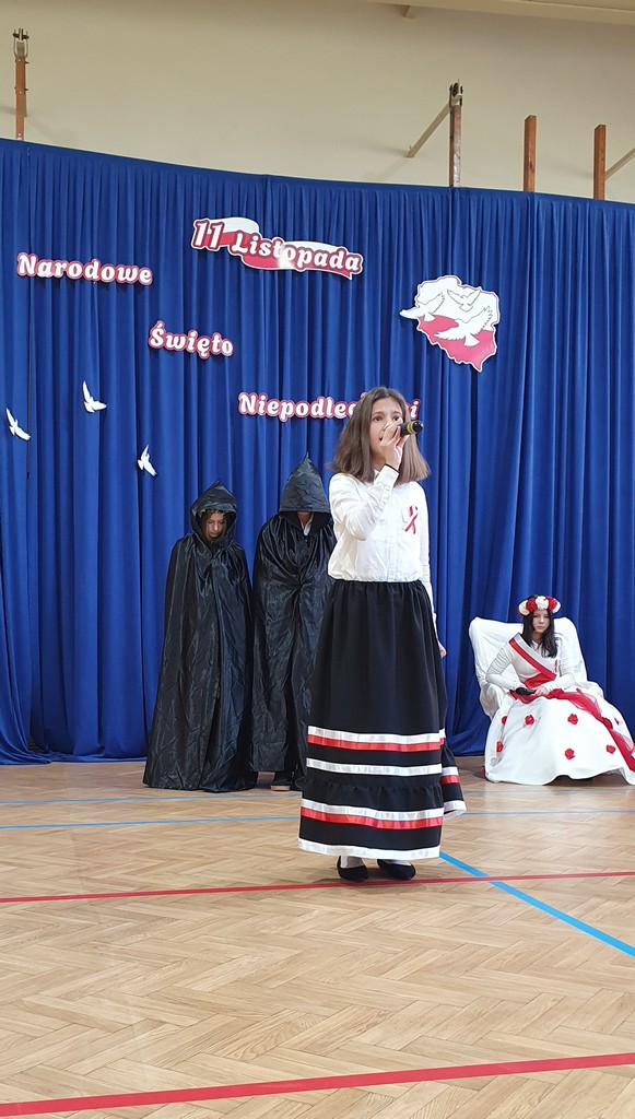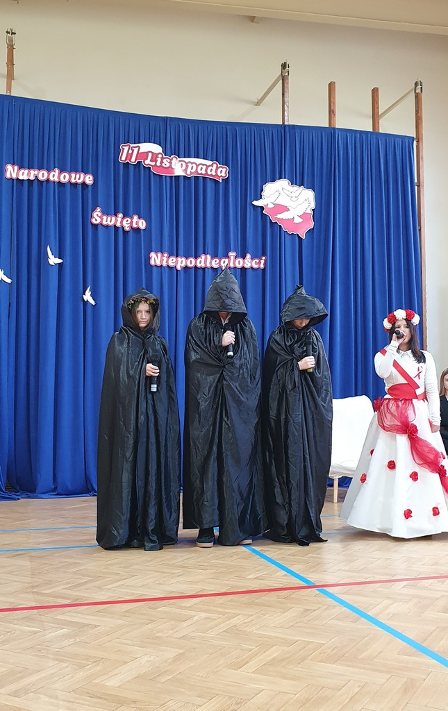 Uczniowie klasy 7b, pod kierunkiem p. Renaty Tokarskiej,  przygotowali inscenizację przedstawiającą dzieje Polski w czasie zaborów. Na scenie pojawiła się uosobiona Polska – symboliczna postać w biało-czerwonej sukni z wiankiem w narodowych barwach na głowie , a obok niej zaborcy w charakterystycznych strojach, reprezentujący trudne momenty naszej historii.