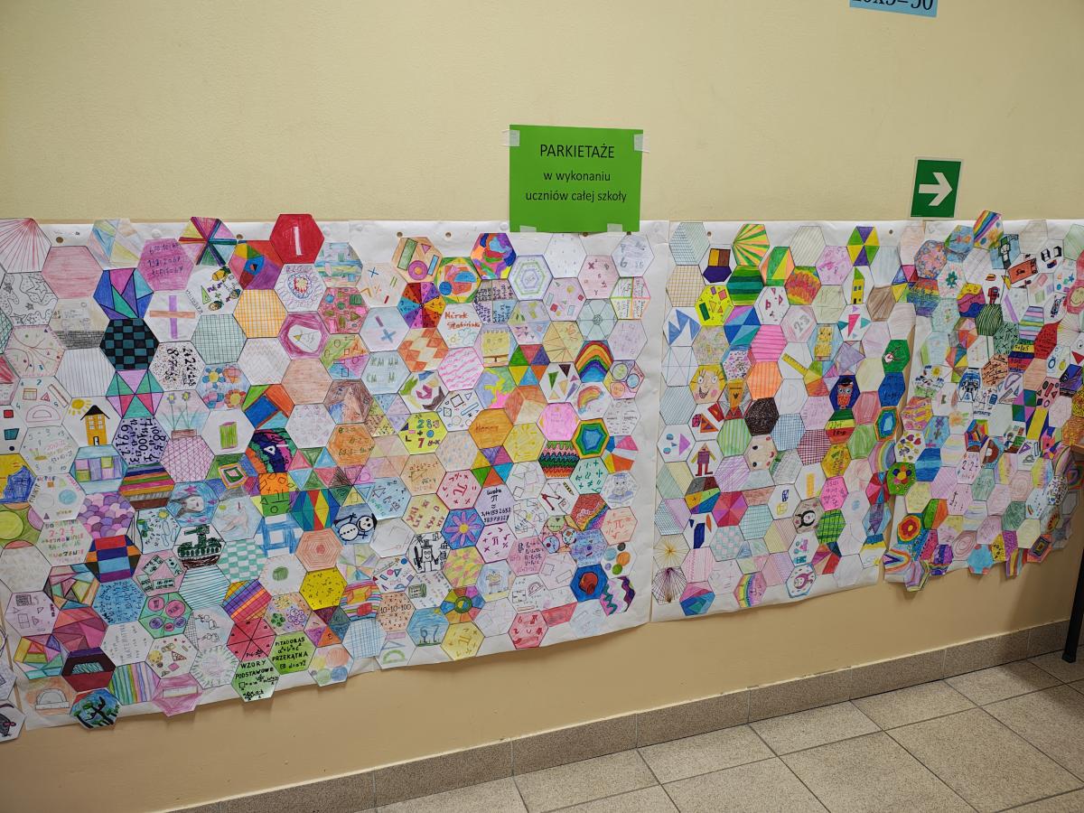 Świętowanie rozpoczęliśmy od podziwiania prac projektowych: „Geometrycznego Zwierzyńca” klas 1–3 oraz makiet „Matematycznej Krainy” i komiksów przygotowanych przez starszych uczniów. Wyjątkowym elementem był Szkolny Parkietaż – każda klasa przygotowała własne „puzzle”, które połączone na głównym korytarzu stworzyły imponujący, wspólny wzór.